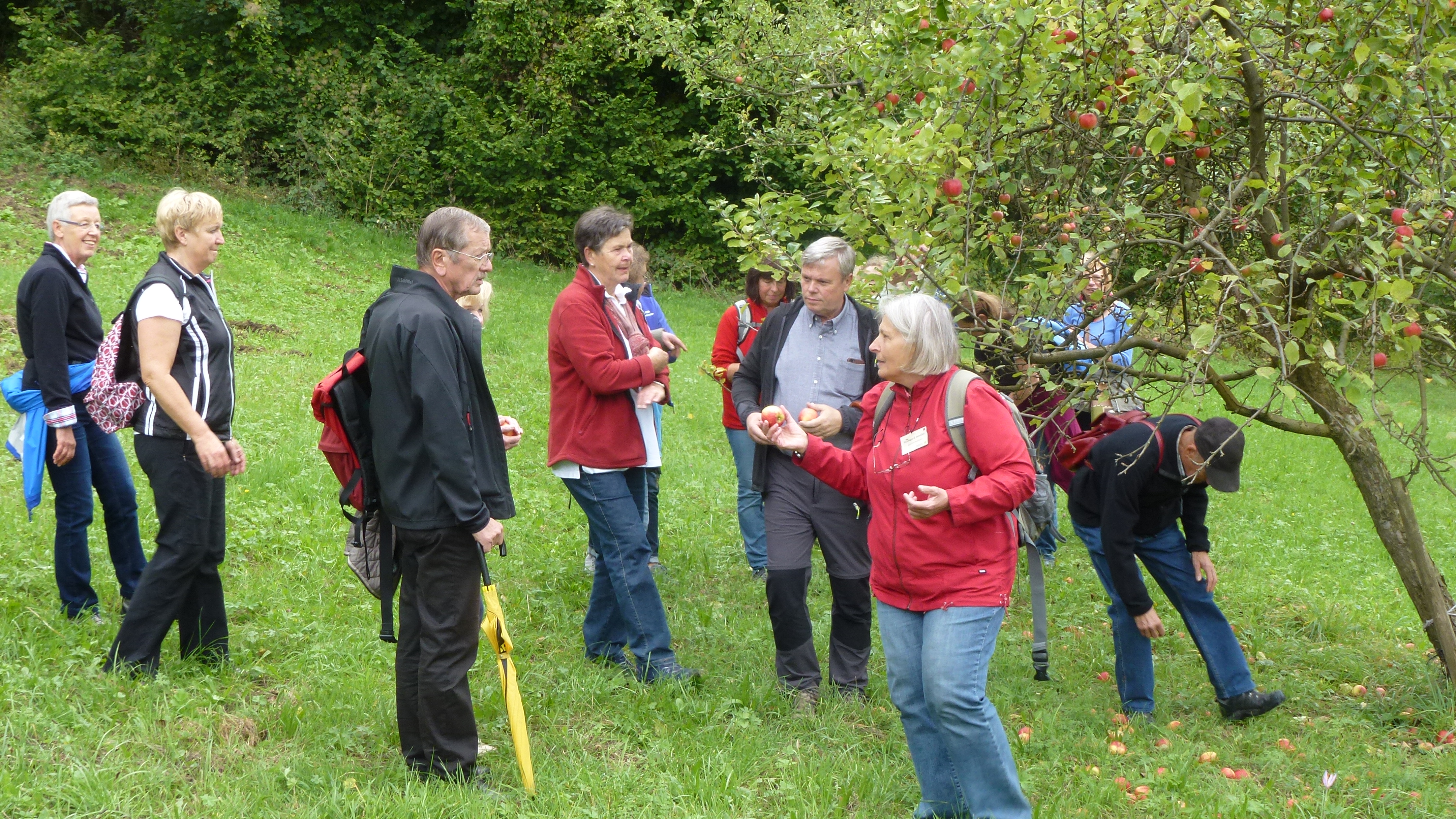 Die Biosphären-Botschafterin Hildegard Drexler führt eine Gruppe Wanderer durch die artenreichen Streuobstwiesen und informiert über die verschiedenen Apfelsorten. Eine Vielzahl von Natur- und LandschaftsführerInnen bieten individuell zugeschnittene, geführte Touren für große und kleine Gruppen, Familien, Vereine und für Betriebsausflüge an. Eines ist ihnen allen dabei gemeinsam: die Freude Ihnen das Biosphärengebiet Schwäbische Alb näher zu bringen!