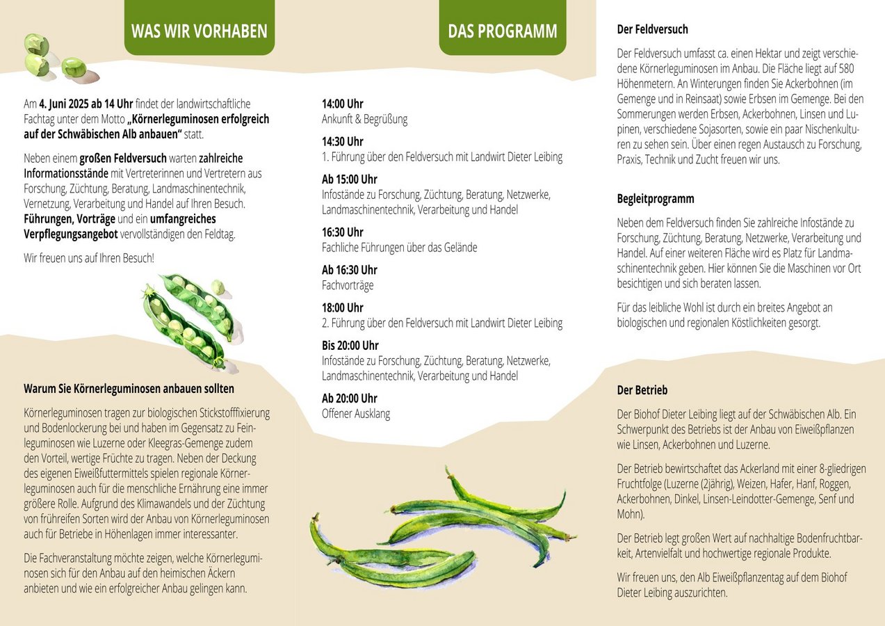 Ziel der Veranstaltung ist es, landwirtschaftlichen Betrieben aufzuzeigen, welches Potenzial inzwischen im Anbau von Körnerleguminosen auch in Höhenlagen besteht. Das Klima ist im Wandel, die Vegetationsperioden werden länger und die Sommer tendenziell trockener. Dazu kommt, dass sich die Züchtung in den letzten Jahren stark weiterentwickelt hat und bereits heute zahlreiche, sehr ertragreiche und frühreife Sorten vorhanden sind. Selbst der Anbau von Soja wird für die Alb interessant. Die Veranstaltung soll diese Potenziale aufzeigen und Landwirtinnen und Landwirten die Möglichkeit geben, sich ausführlich zu informieren.