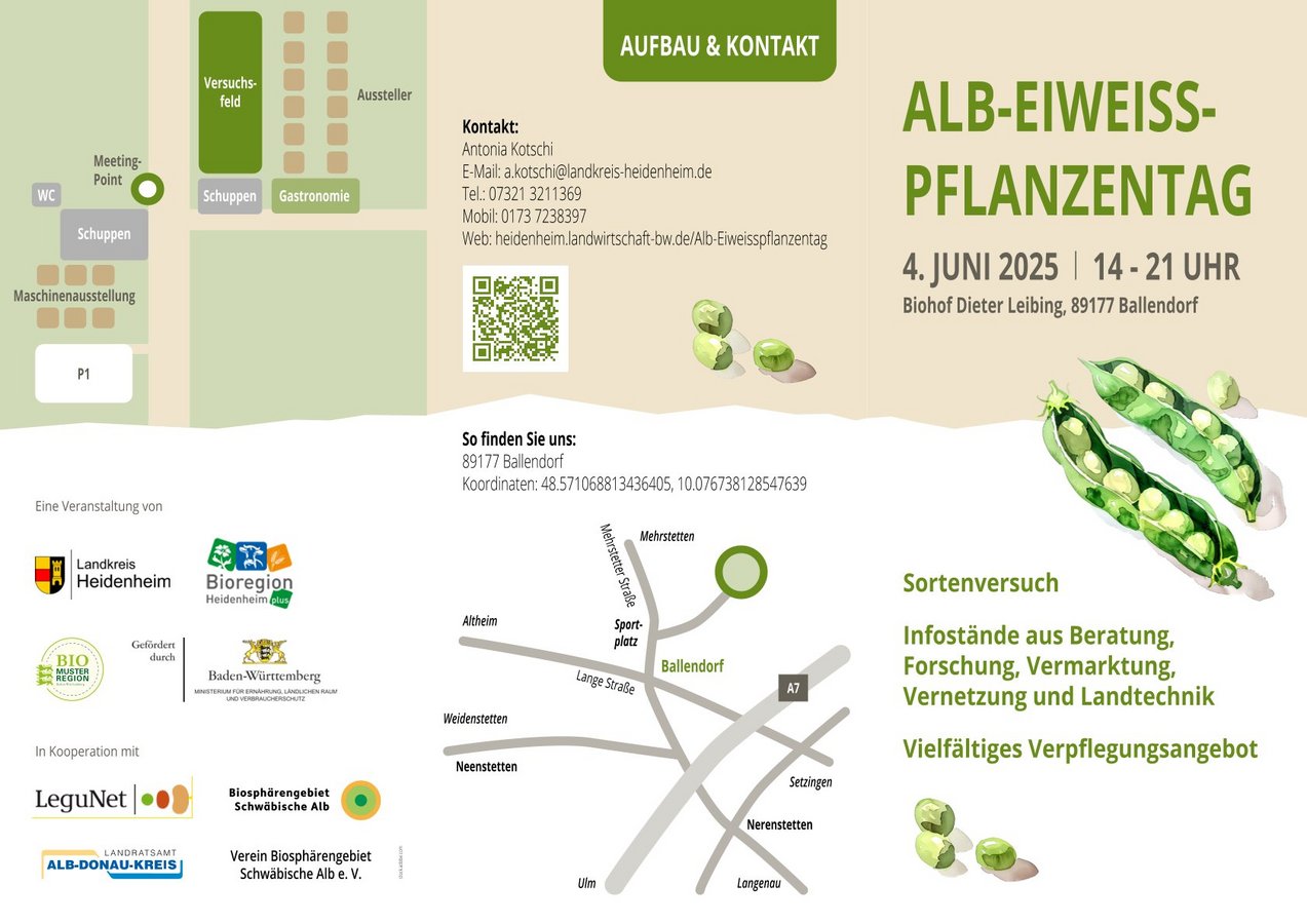 Am 4. Juni 2025 findet in Ballendorf (Alb-Donau-Kreis) der erste landkreisübergreifende Alb-Eiweißpflanzentag statt. Die „Bio-Musterregion Heidenheim plus“ organisiert in Kooperation mit den zwei Landratsämtern Heidenheim und Alb-Donau-Kreis, der „Bio-Musterregion Biosphärengebiet Schwäbische Alb“ und dem Projekt „LeguNet“ einen landwirtschaftlichen Fachtag zu dem Thema „Körnerleguminosen erfolgreich auf der Schwäbischen Alb anbauen“.