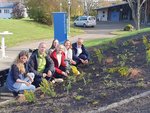 Bildunterschrift: Spendenübergabe und Pflanzaktion der Frühblüher aus dem „Staudenmix Bienensommer“ vor der Alb-Halle in Westerheim, v.l.n.r. Anna-Naemi Krauß (Biosphärengebiet Schwäbische Alb e.V.), Roland Heidelberg (Geschäftsstelle Biosphärengebiet Schwäbische Alb), Louisa Häußler (TressBrüder), Jelena Tuka (BIO-Gasthof Friedrichshöhle), Anna Staudenmayer (Peter Staudenmayer Garten- und Landschaftsbau, Westerheim), Bürgermeister Hartmut Walz