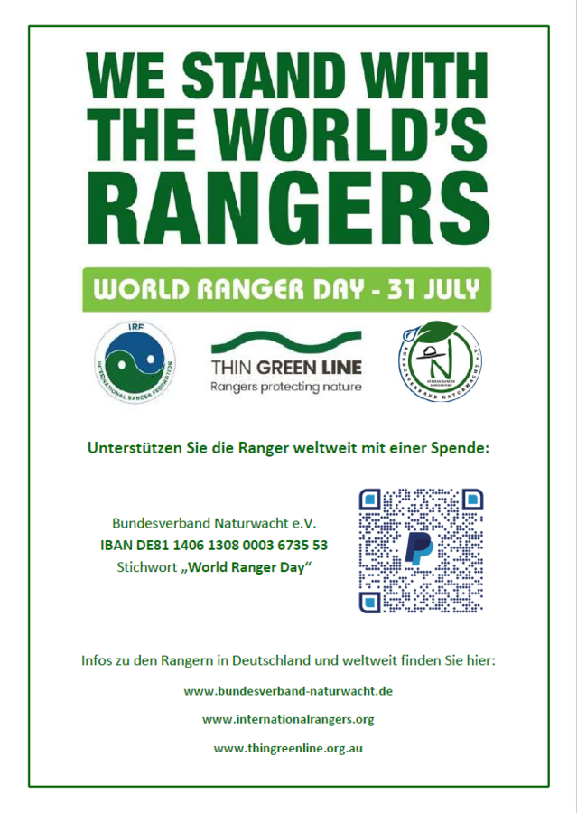 Der Jahrestag macht auch auf die Probleme der internationalen Ranger-Gemeinschaft mit weltweit ca. 285.000 Berufstätigen aufmerksam. „Ranger*innen sind von entscheidender Bedeutung für den Schutz der Natur und den Erhalt der Artenvielfalt. Doch sie sehen sich weltweit mit zahlreichen Herausforderungen wie Wilderei, schlechten Arbeitsbedingungen und unzureichender Ausrüstung konfrontiert“, so Milena Kreiling, Co-Vorsitzende des Bundes-verbandes Naturwacht e. V. Jedes Jahr sterben weltweit rund 150 Ranger*innen während ihres Dienstes. „Auch darüber wollen wir am Welt-Ranger-Tag berichten und Spenden für Familien sammeln, die ein Familienmitglied durch die gefährliche Arbeit im Einsatz für die Natur verloren haben“, erläutert Kreiling. Der Bundesverband Naturwacht e. V. sammelt diese Spenden und gibt sie gebündelt an die Thin Green Line Foundation weiter. Diese Stiftung stellt sie den Hinterbliebenen zur Verfügung, bietet Fortbildungen an oder besorgt dringend benötigte Ausrüstung. In vielen Ländern gehören dazu grundlegende Dinge wie Outdoor-Stiefel oder Erste-Hilfe-Pakete.