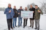 v. l. n. r.: Hans Offenwanger (Geschäftsstelle Biosphärengebiet), Alexander Haag (Flächeneigentümer), Achim Nagel (Leiter Geschäftsstelle Biosphärengebiet), Jacqueline Lohde (Erste Bürgermeisterin Stadt Metzingen), Siegfried Apfel, (Geschäftsführung Siedlungswerk) und Hannes Rau (Geschäftsstelle Biosphärengebiet) bei der symbolischen Scheckübergabe; © Siedlungswerk