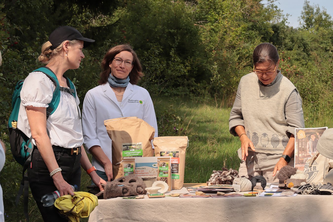 Ministerin Thekla Walker im Gespräch mit Lydia Steffan (Verein BSG Schwäbische Alb e.V.) und Veronika Kraiser (Firma Flomax) über innovative Wollprodukte, Ministerin Thekla Walker unterwegs im Lautertal im Gespräch mit Mike Münzing (Bürgermeister).