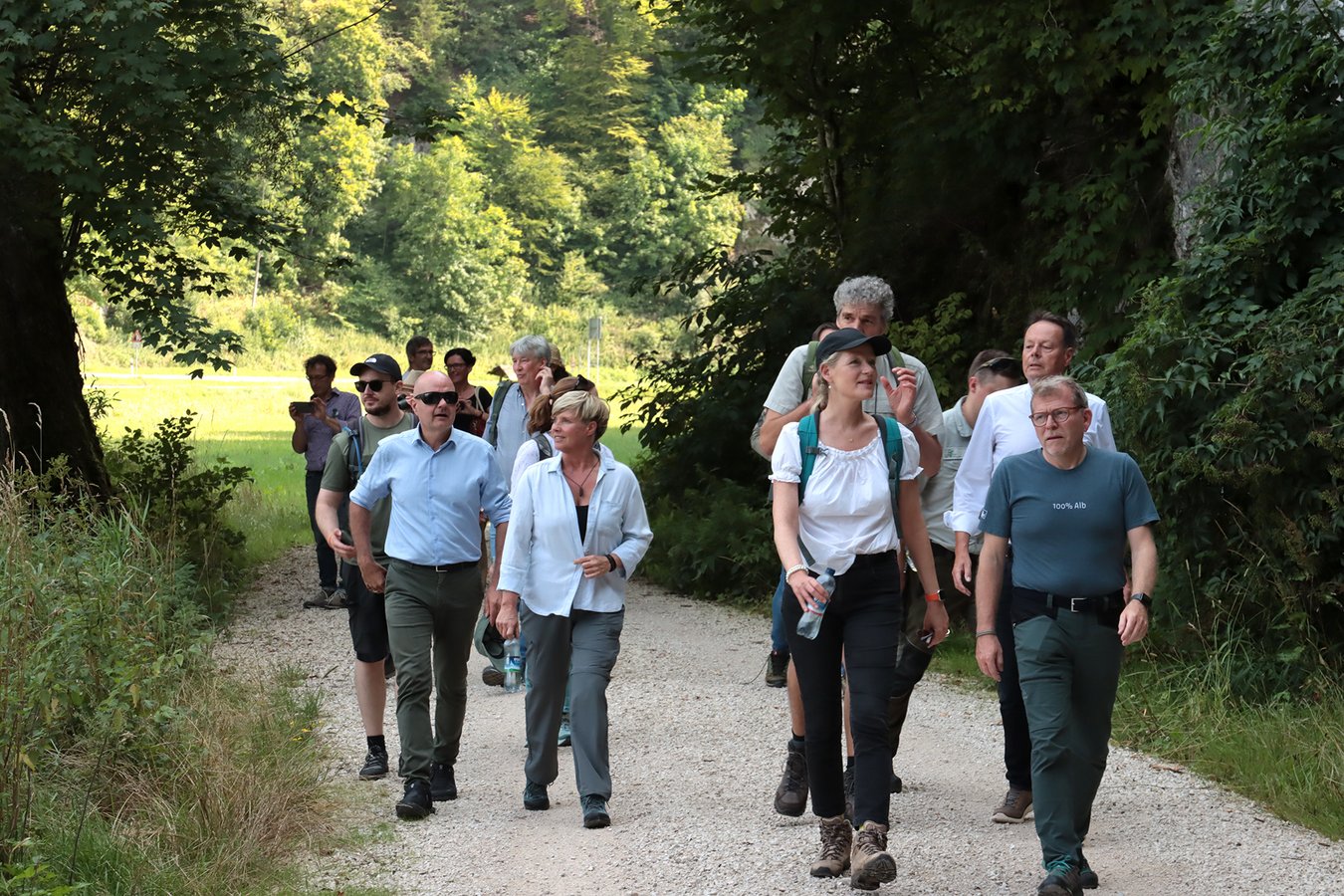 Thekla Walker, Ministerin für Umwelt, Klima und Energiewirtschaft Baden-Württemberg besuchte anlässlich ihrer diesjährigen Sommertour am 6. August 2025 das von der UNESCO ausgezeichnete Biosphärengebiet Schwäbische Alb. Im Rahmen einer Wanderung entlang der Route des Premiumwanderweges „hochgehswiggert“ im Landkreis Reutlingen informierte sich die Ministerin an insgesamt fünf Stationen über zentrale Themen sowie aktuelle Projekte im Biosphärengebiet und kam mit zahlreichen Akteurinnen und Akteuren aus der Region ins Gespräch.