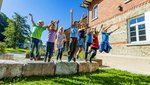 Kinder springen mit ausgestreckten Armen von Gartensteinen herunter