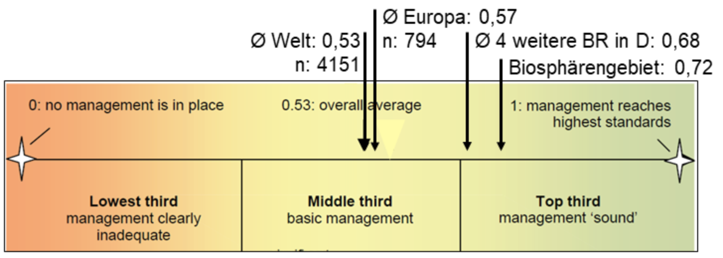 Im Rahmen eines eintägigen Workshops diskutierten 9 Mitarbeiter der Geschäftsstelle Fragen zum Biosphärengebiet und dessen Management, mittels 71 Leitfragen. Der Fragebogen basiert auf dem international angewendeten „Management Effectiveness Tracking Tool“ zur Evaluierung von Schutzgebieten, angepasst um spezifische Fragen für Biosphärenreservate. Moderiert wurde der Workshop von Prof. Dr. Stoll-Kleemann und Uta Runst von der Universität Greifswald. Der Workshop ergab, dass die Managementeffektivität des Biosphärengebiets als „solide“ bewertet wird. Mit einem Ergebnis von 0,72 (auf einer Skala von 0 bis 1) schnitt das Biosphärengebiet besser ab, als Schutzgebiete in Europa (im Mittel 0,57; n=794) und weltweit (0,53 n=4.151). In einzelnen Bereichen kann die Effektivität weiter gesteigert werden, z. B. durch weiteres Personal und weitere Aktivitäten in den Bereichen Mobilität und Soziales (Runst & Stoll-Kleemann 2018).