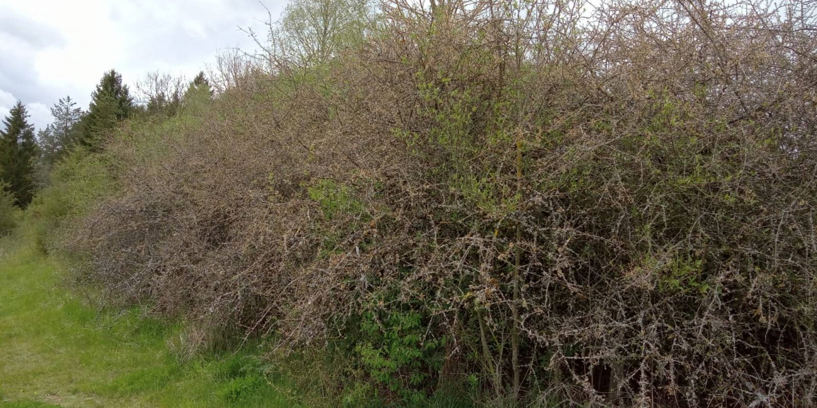 Die Schlehe (Prunus spinosa) hat einen stark dornigen Strauch und dunkelblaue bis schwarze Früchte. Die weißen Blüten erscheinen vor den Blättern. Der Strauch nimmt eine Höhe zwischen 1-3 m an. Oftmals bildet die Pflanze undurchdringliche Dickichte aus.