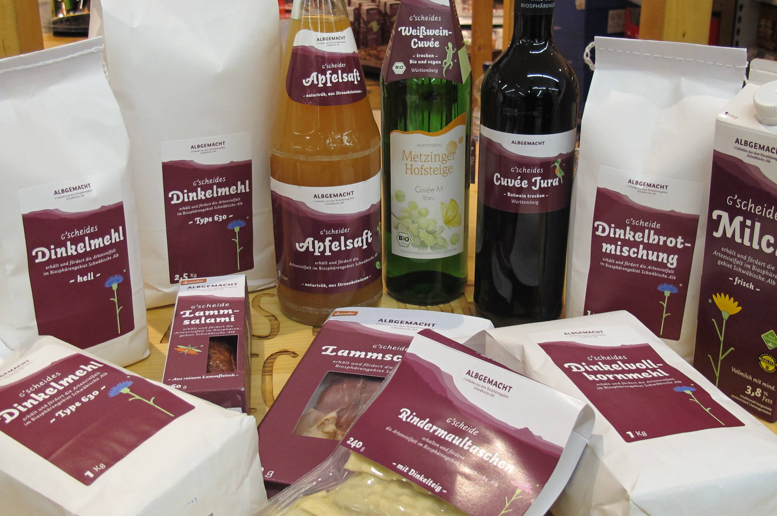 Unter der Marke „ALBGEMACHT“ werden schmackhafte Lebensmittel des täglichen Bedarfs naturschutzorientiert hergestellt und in der Region vermarktet. Darüber hinaus eignen sich vielfältige regionale Getränke wie Fruchtsäfte, Weine oder Liköre oder auch die Alblinse, Büffelmozarella, Marmeladen und viele mehr sich als „Mitbringsel“ von einer Tour oder einem Urlaub im Biosphärengebiet.