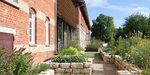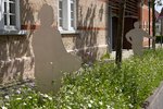 Blick auf ein Backsteingebäude mit Garten