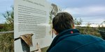 Ein Mann schaut sich ein Schild in der Natur an